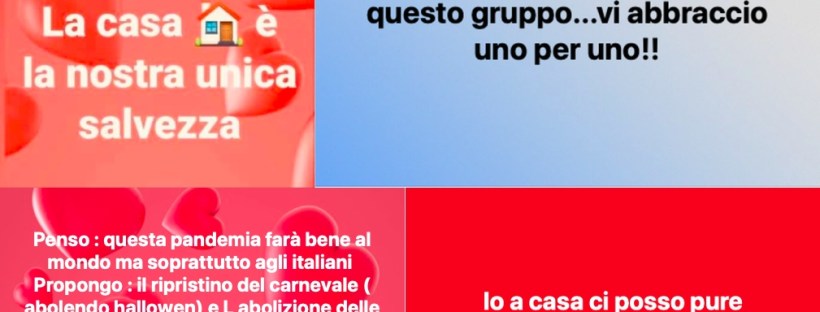 This post builds on exploratory analysis out of a total of 233 Facebook groups dedicated to activities to do at home during quarantine. In each group we searched for relevant keywords such as “migrants”, “immigration” and “homeless” across the communication flows between group members. Out of the material thus collected, we selected randomly an overall number of 278 between posts, pictures and comments.